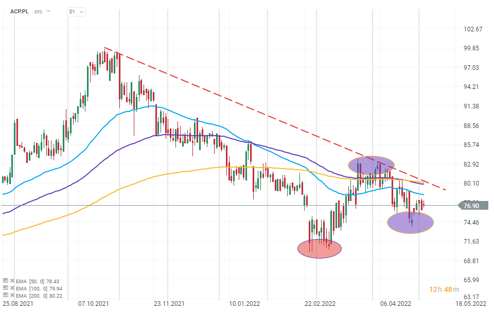 Wykres akcji spółki Asseco (ACP.PL), interwał D1. Z technicznego punktu widzenia walory spółki starają się odreagowywać rozpoczętą w 4 kwartale 2021 roku falę wyprzedaży akcji spółki. W chwili obecnej za rejony silny oporów uchodzą poziomy bliskie górnego ograniczenia trendu spadkowego (czerwona linia) oraz zbiegu wykładniczych, średnich kroczących (niebieska; EMA 50, fioletowa; EMA 100 oraz złota linia; EMA 200). Wsparciem pozostaje minimum z 27 kwietnia. Źródło: xStation 5