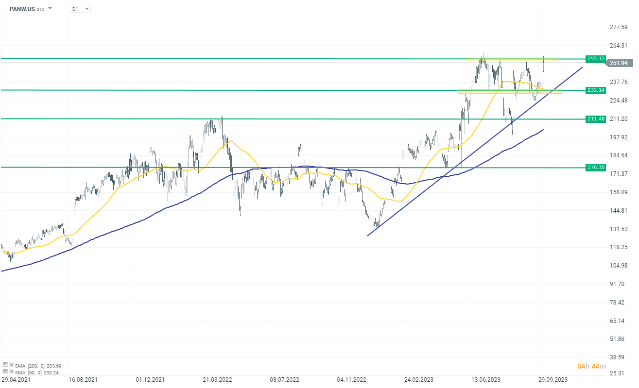 W obliczu eskalacji konfliktu dotknięte zostały również spółki zajmujące się cyberbezpieczeństwem, również te notowane w USA, a które prowadzą działalność w Izraelu. Izrael jest bowiem pionierem innowacyjnych rozwiązań z sektora cyberbezpieczeństwa. BlueStar Israel Technology, czyli ETF który gromadzi spółki technologiczne z Izraelu traci dzisiaj ponad 3,0%, odzwierciedlając wpływ wojny na firmy technologiczne. Wśród dotkniętych spółek potencjalnie znajduje się Palo Alto Networks (PANW.US), która przejęła kilka izraelskich firm, takich jak Cider i Cyber Secdo. Mimo to, spółka tylko na początku sesji odnotowała niewielki spadek o 0,3%. Spadki zostały szybko zredukowane i obecnie Palo Alto Networks zyskuje ponad 2,0%. Najprawdopodobniej inwestorzy oprócz ryzyka, zaczęli również wyceniać większe szanse na szybszy wzrost rynku w wyniku eskalacji napięć geopolitycznych.