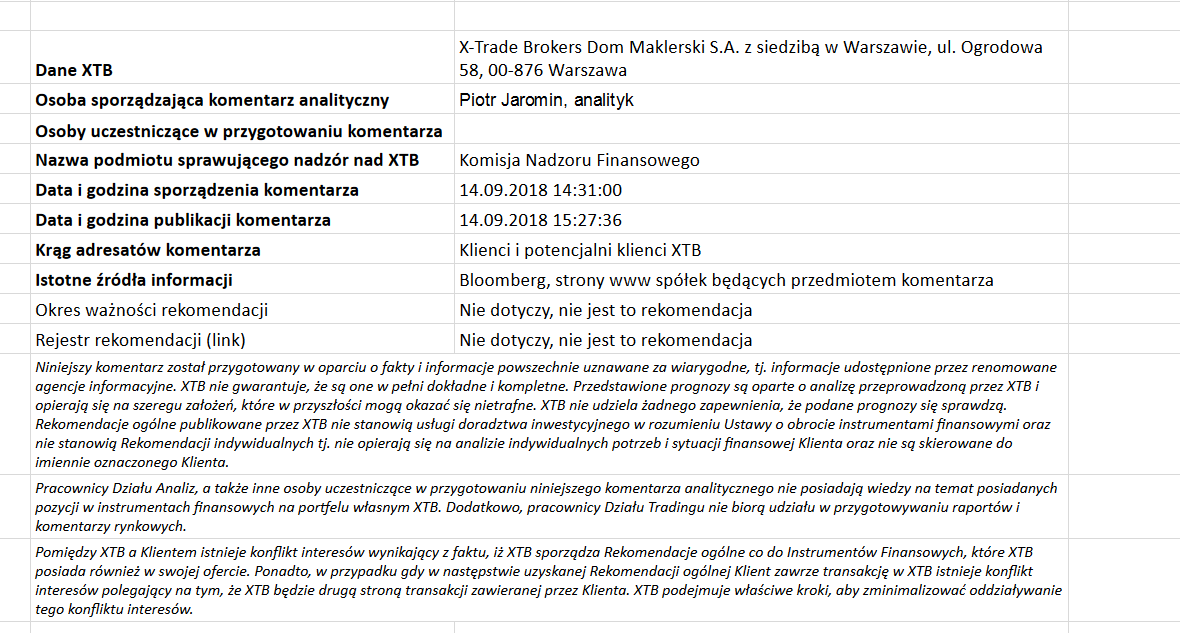 Ta publikacja handlowa jest informacyjna i edukacyjna. Nie jest rekomendacją inwestycyjną ani informacją rekomendującą lub sugerującą strategię inwestycyjną. W materiale nie sugerujemy żadnej strategii inwestycyjnej ani nie świadczymy usługi doradztwa inwestycyjnego. Materiał nie uwzględnia indywidualnej sytuacji finansowej, potrzeb i celów inwestycyjnych klienta. Nie jest też ofertą sprzedaży ani subskrypcji. Nie jest zaproszeniem do nabycia, reklamą ani promocją jakichkolwiek instrumentów finansowych. Publikację handlową przygotowaliśmy starannie i obiektywnie. Przedstawiamy stan faktyczny znany autorom w chwili tworzenia dokumentu. Nie umieszczamy w nim żadnych elementów oceniających. Informacje i badania oparte na historycznych danych lub wynikach oraz prognozy nie stanowią pewnego wskaźnika na przyszłość. Nie odpowiadamy za Twoje działania lub zaniechania, zwłaszcza za to, że zdecydujesz się nabyć lub zbyć instrumenty finansowe na podstawie informacji z tej publikacji handlowej. Nie odpowiadamy też za szkody, które mogą wynikać z bezpośredniego czy też pośredniego wykorzystania tych informacji. Inwestowanie jest ryzykowne. Inwestuj odpowiedzialnie.