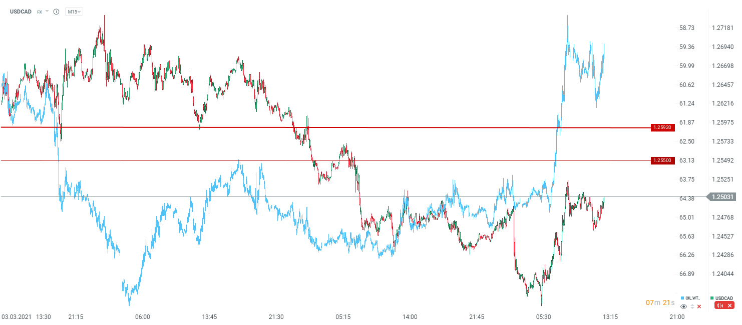 USDCAD odbija, co ma związek głównie z tym, co dzieje się w ceną ropy naftowej. Pomimo próby odbicia cen po wczorajszej ogromnej wyprzedaży, ropa powraca w okolice wczorajszych dołków. WTI poniżej poziomu 60 dolarów za baryłkę. Źródło: xStation5