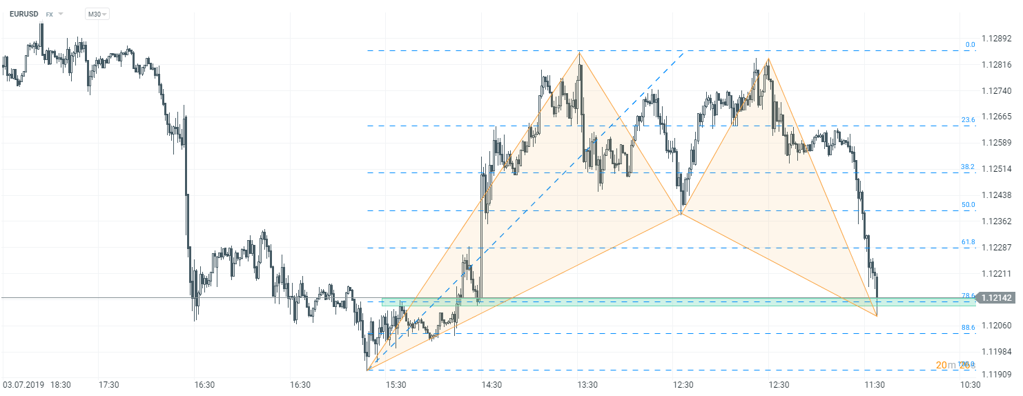 Zaraz po peirwszej reakcji, możemy obserwować szybki odwrót, cena reaguje na wysokości współczynnika 78,6%. Jeżeli wsparcie będzie bronione, niewykluczony jest prowzrostowy układ harmoniczny.