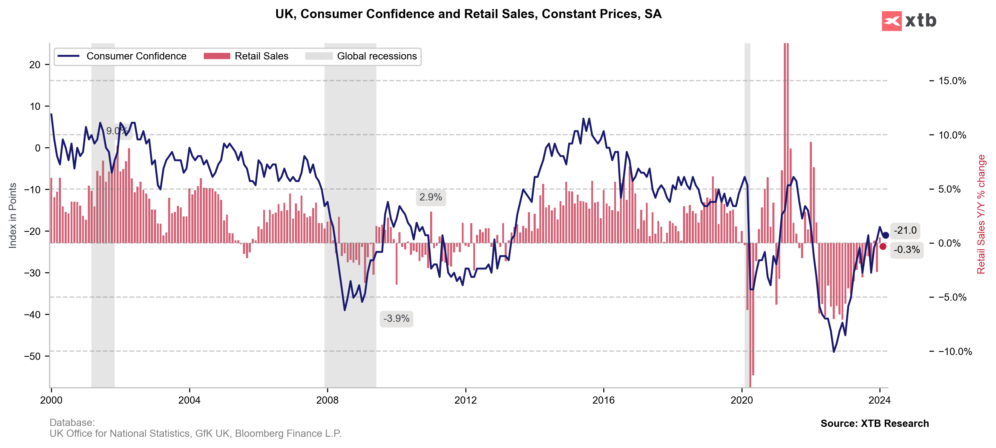 Dynamika sprzedaży detalicznej w UK po lekkim odbiciu z lutego znów powraca do ujemnych wartości. Wyższą sprzedaż odnotowały sklepy ze sprzętem elektronicznym, sklepy meblowe, stacje benzynowe oraz sklepy odzieżowe. Wzrosty te zostały jednak skompensowane przez spadającą sprzedaż żywności i spadającą sprzedaż w domach towarowych. Sprzedawcy zwracają uwagę na obniżone wolumeny sprzedaży wynikające z wyższych cen.