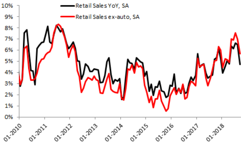 Najważniejsza publikacja na dziś z Ameryki Północnej pokazała nieoczekiwane spowolnienie w wydatkach konsumenckich w Stanach Zjednoczonych, nie pomagając tym samym dolarowi amerykańskiemu, który dzisiaj pozostaje osłabiony wobec innych ważniejszych walut świata. Wzrost amerykańskiej sprzedaży detalicznej we wrześniu wyniósł 0,1% m/m, czyli dużo mniej niż oczekiwany wzrost na poziomie 0,6% m/m, powtarzając tym samym wartość, która została opublikowana ostatnim razem. Odczyt bazowy okazał się jeszcze gorszy, pokazując po raz pierwszy w tym roku spadek, który był na poziomie 0,1%. W porównaniu do oczekiwań wzrostu na poziomie 0,4%, a także wzrostu na poziomie 0,3% w zeszłym miesiącu, publikacja również w tym temacie wypadła dosyć słabo.