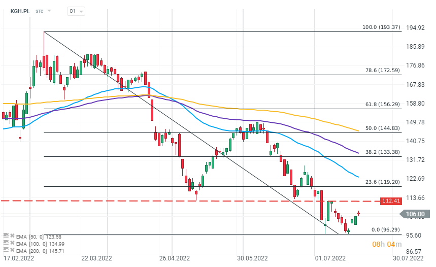 Z technicznego punktu widzenia na wykresie notowań akcji spółki KGH.PL dostrzegamy próbę wybicia od lokalnych dołków na poziomie 96 zł za walor. Strefa blisko 112 zł uchodzi obecnie za potencjalne rejony oporu. Źródło: xStation 5