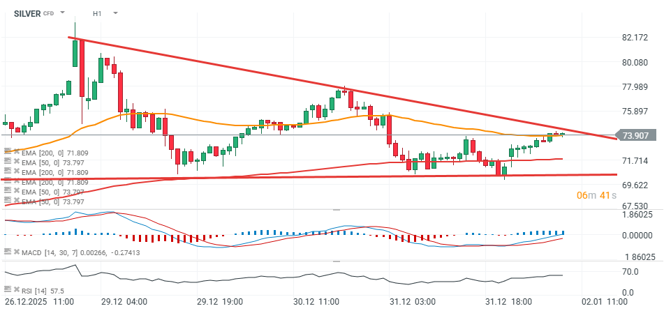 Notowania srebra notują ponad 4% wzrost w nowym roku, próbując wrócić do dynamicznych wzrostów. Cena kruszcu kolejny raz zareagowała pozytywne w obszarze 70 USD, tworząc tym samym podwójne dno na tym poziomie. Wróciła też powyżej wykładniczych średnich kroczących EMA200 i EMA50 na interwale godzinowym. Z drugiej strony jednak widzimy potencjalnie rysującą się formację trójkąta zniżkującego, którego dolną granicę (podstawę) wyznacza poziom 70 USD. Jeśli cena nie zdoła na dobrze przebić okolic 74,5 - 75 USD, może dojść do realizacji spadkowego scenariusza i kolejnego impulsu spadkowego, który w tym przypadku mógłby zgodnie z metodologią 1:1 sprowadzić cenę stopniowo w okolice 65 - 66 USD za uncję. Wzrost powyżej 76 USD zwiększyłby szansę zanegowania spadkowej formacji technicznej.