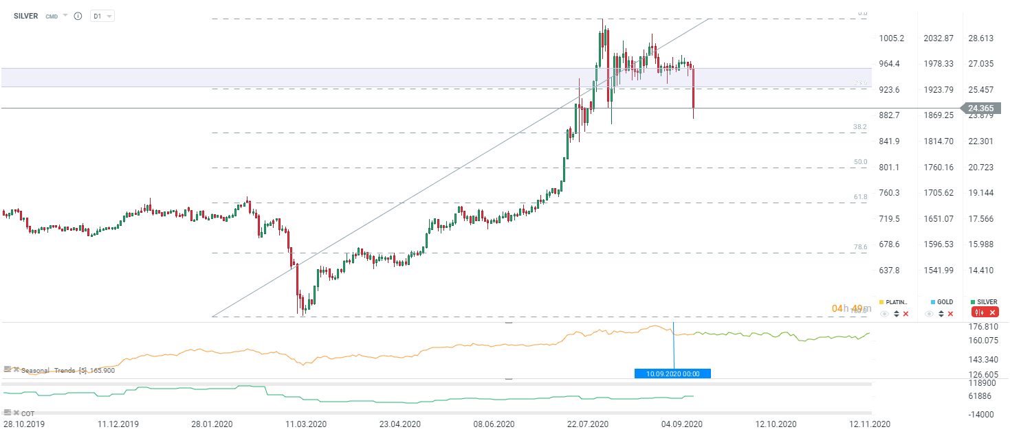 Srebro jest najtańsze od 12 sierpnia, natomiast od lokalnego szczytu z poprzedniego miesiąca jest już niżej o ok. 20%. Najbliższe wsparcie to okolice zniesienia 38.2. Źródło: xStation5