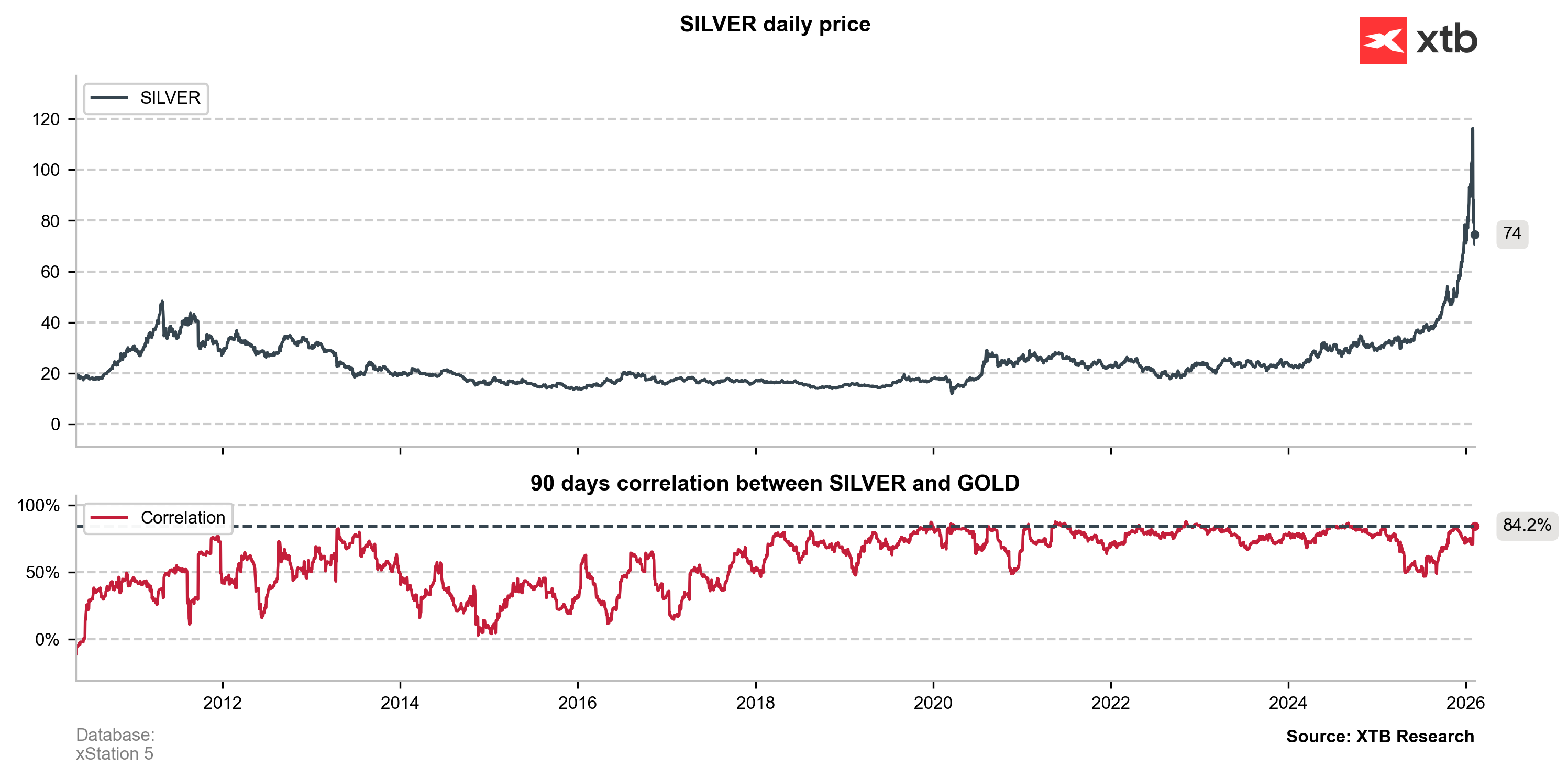 Aktualnie srebro i złoto poruszają się niemal w 'tandemie' - korelacja sięga historycznie bardzo wysokich wartości.