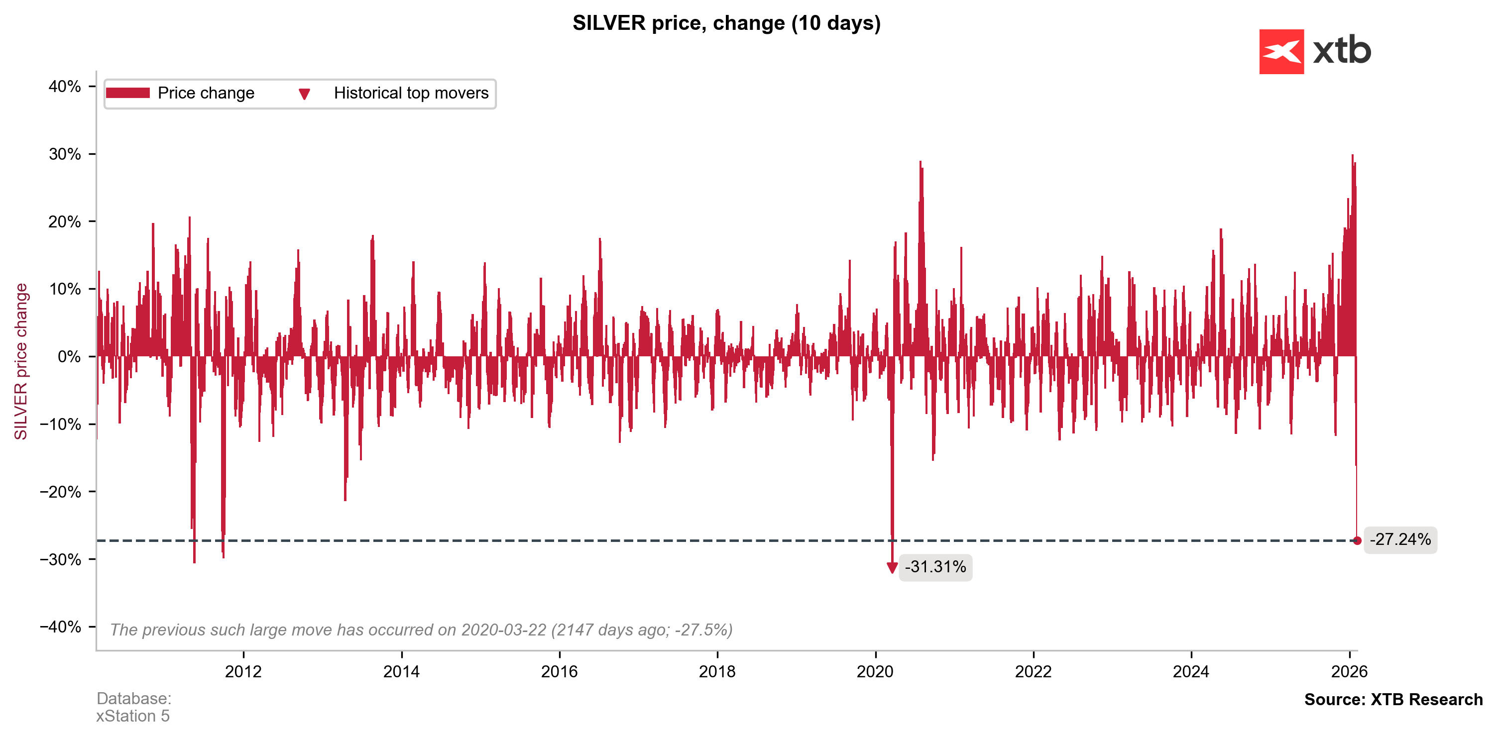 Ostatni raz tak silny ruch na srebrze miał miejsce w marcu 2020 roku, podczas covidowego krachu. Wszystko wskazuje na to, że w najbliższym czasie zmienność pozostanie podwyższona.