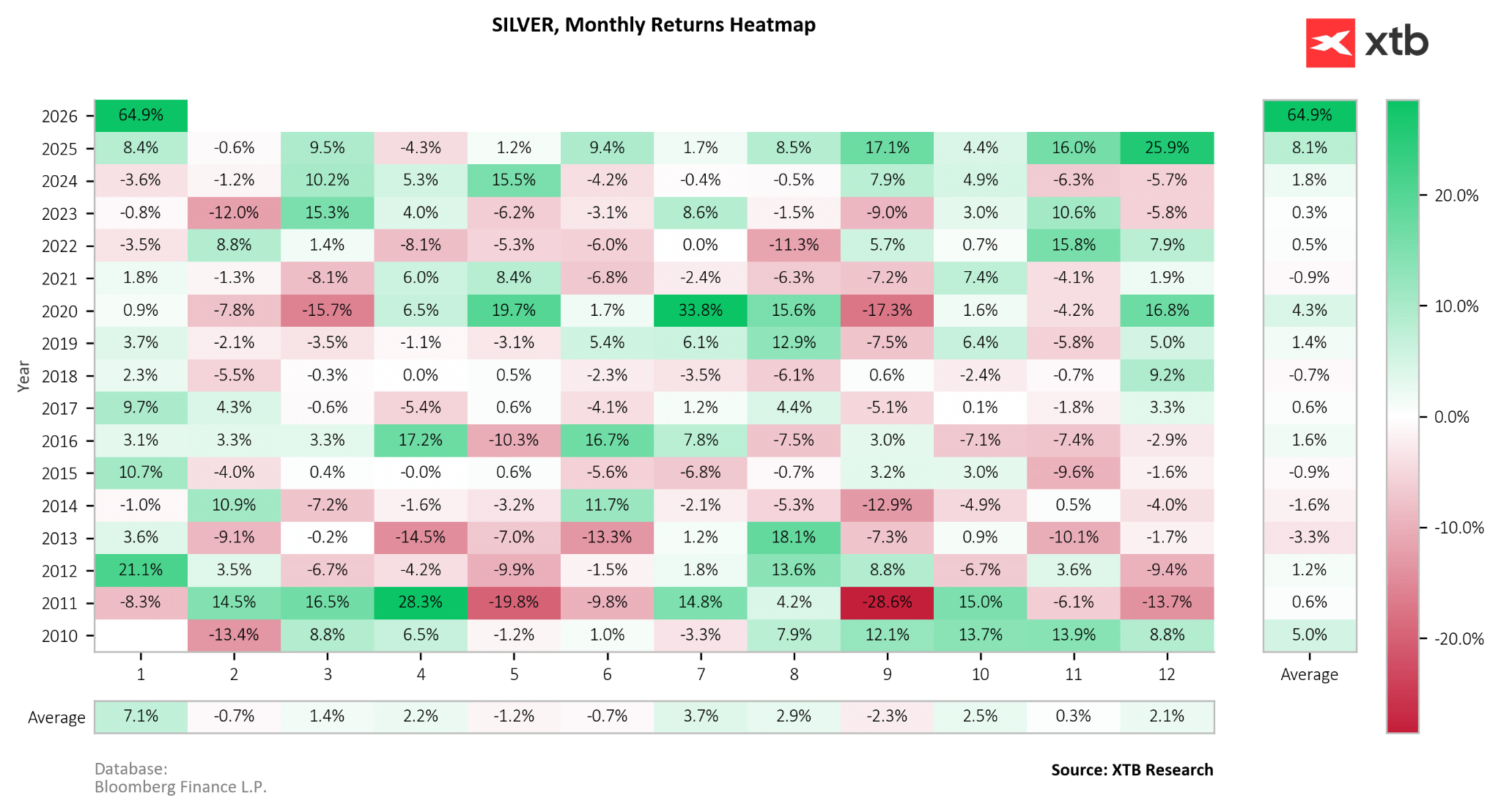 W ujęciu miesięcznym srebro ma za sobą dwa imponujące miesiące, odpowiednio 25,9% oraz 64,9% w grudniu 2025 roku i styczniu 2026 roku. Styczeń jest również historycznie najmocniejszym miesiącem dla srebra nawet wyłączając rekordowy rok bieżący. Natomiast w lutym i marcu korekty były częstsze. Źródło: XTB Research