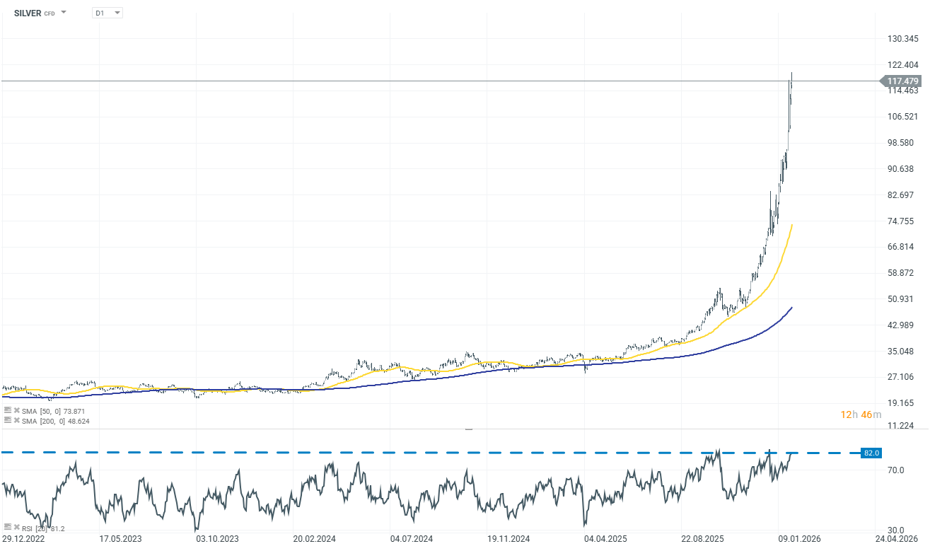 Od strony cenowej srebro pozostaje jednak niezwykle silne. Notowania wystrzeliły na nowe historyczne maksima powyżej 119 USD za uncję i są już prawie 65% wyżej od początku roku, po gigantycznym wzroście o 146% w 2025 roku.
