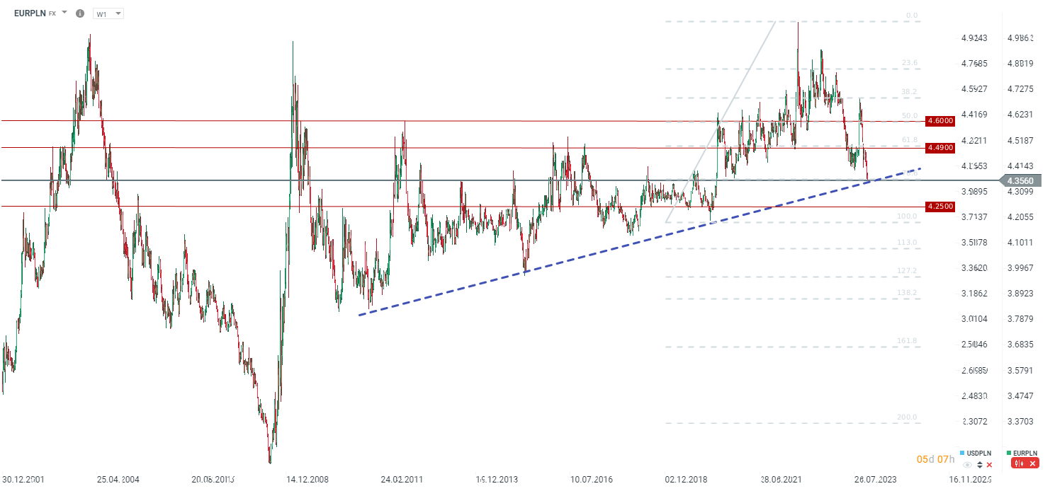 Jak wskazują doniesienia z UE, w przyszłym miesiącu może dojść do zatwierdzenia wypłaty pierwszej transzy środków z KPO w kwocie ponad 5 mld EUR. Co ciekawe, do zatwierdzenia ma dojść nawet pomimo braku spełnienia niektórych kamieni milowych, do których zobowiązania była Polska. "Kamienie milowe" miały dotyczyć m.in. sądownictwa. Tymczasem dobre nastroje globalne oraz czynniki wewnętrzne związane z potencjalnym zastrzykiem gotówki dla Polski powodują dalsze umocnienie złotego. EURPLN testuje okolice poziomu 4,35. Obecnie testowane jest ważne wsparcie związane ze wzrostową linią trendu oraz zniesieniem 78.6 ostatniej dużej fali wzrostowej na parze. Po przekroczeniu tego poziomu kolejne ważne poziomu to 4,30 oraz 4,25.