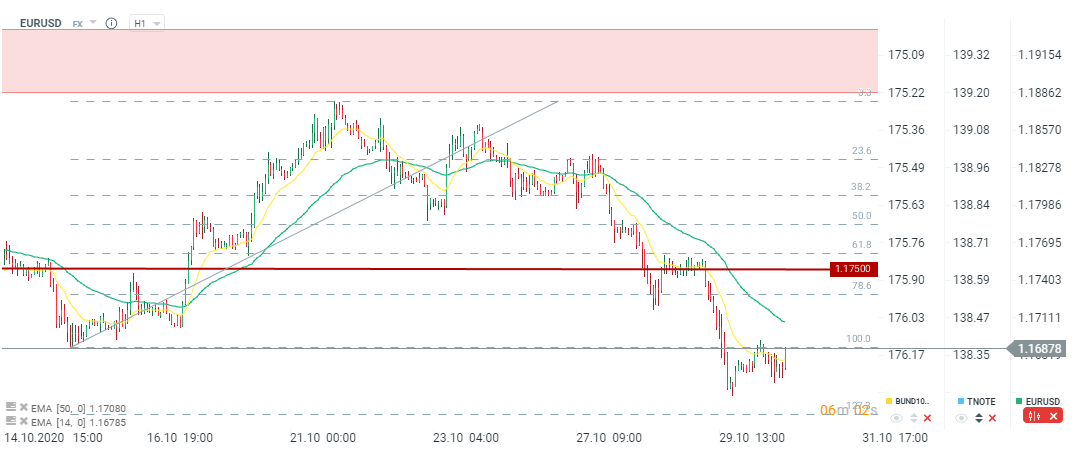 EURUSD próbuje powrócić w okolice poziomu 1,1700. Niemniej widać, że mamy do czynienia z silną strefą podażową powiązaną ze średnimi ruchomymi. Źródło: xStation5