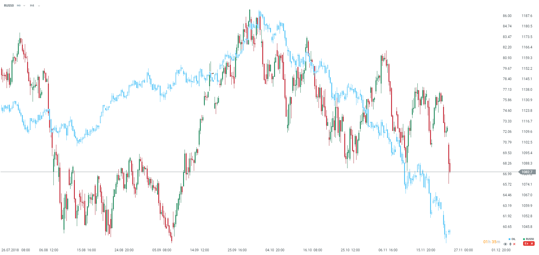 Oficjalnie prezydent Ukrainy, Petro Poroshenko podpisał dekret o wprowadzeniu stanu wojennego na Ukrainie. Reakcja na rynkach jest jednak ograniczona, ze względu na to, iż spodziewano się takiego ruchu ze strony Ukraińskich Władz. Po porannym lekkim odbiciu na indeksie RTS obecnie obserujemy pogiłębienie ruchu, choć brakuje jeszcze kilku punktów do dzisiejszego minimum z okolic 1075 punktów.