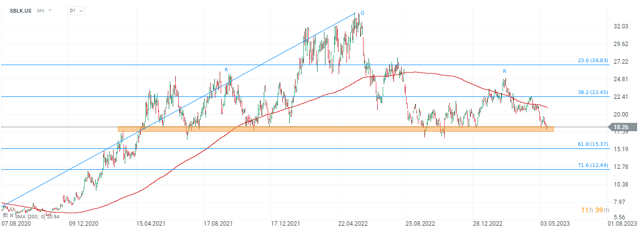 Akcje StarBulk Carriers, interwał D1. Niepokojąco na wykresie akcji spółki wygląda spadek poniżej SMA200 oraz formacja głowy z ramionami (RGR), która może poprzedzać spadek poniżej linii szyi, która przebiega w okolicach 18 USD za walor. Źródło: xStation5