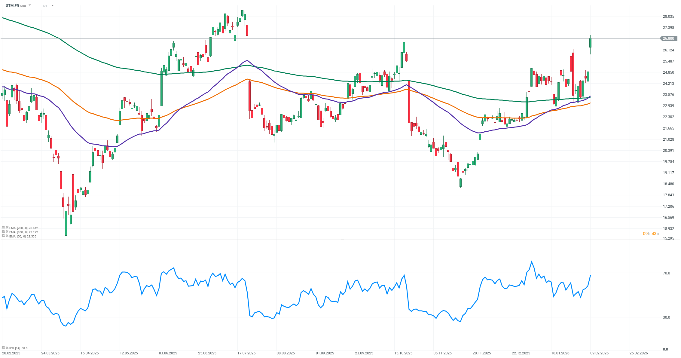 Akcje STMicroelectronics (STM) notują podczas dzisiejszej sesji wzrost o ponad 6% po ogłoszeniu znaczącego rozszerzenia współpracy z Amazon Web Services (AWS). Nowa umowa stawia STM w roli strategicznego dostawcy półprzewodników dla infrastruktury chmurowej i centrów danych AWS, obejmując mikrosterowniki, układy analogowe oraz narzędzia wspierające projektowanie chipów. Rynek zareagował entuzjastycznie, traktując partnerstwo jako silny impuls do przyspieszenia wzrostu przychodów spółki w segmentach wysokowydajnych obliczeń i sztucznej inteligencji.