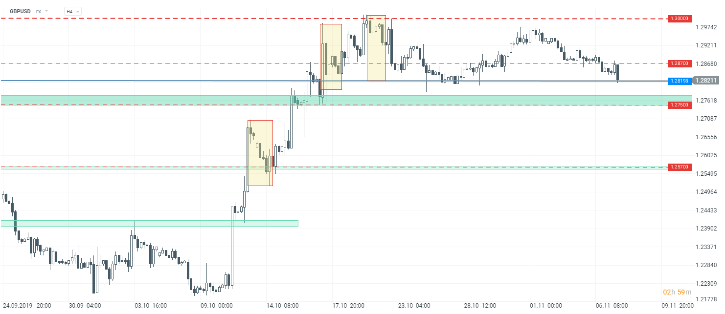 GBPUSD interwał H4. Para walutowa dociera po raz kolejny do dolnego ograniczenia układu 1:1. Źródło: xStation5