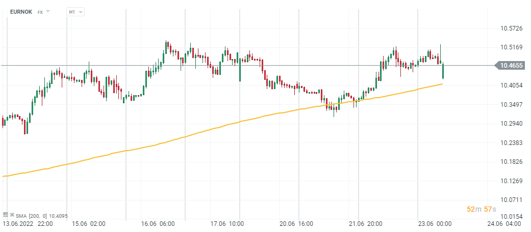 W pierwszej chwili po ogłoszeniu decyzji o stopach procentowych NOK umocnił się względem EUR, jednak w chwili obecnej skala aprecjacji norweskiej waluty została praktycznie całkowicie zanegowana. Para EURNOK, interwał H1. Źródło: xStation 5