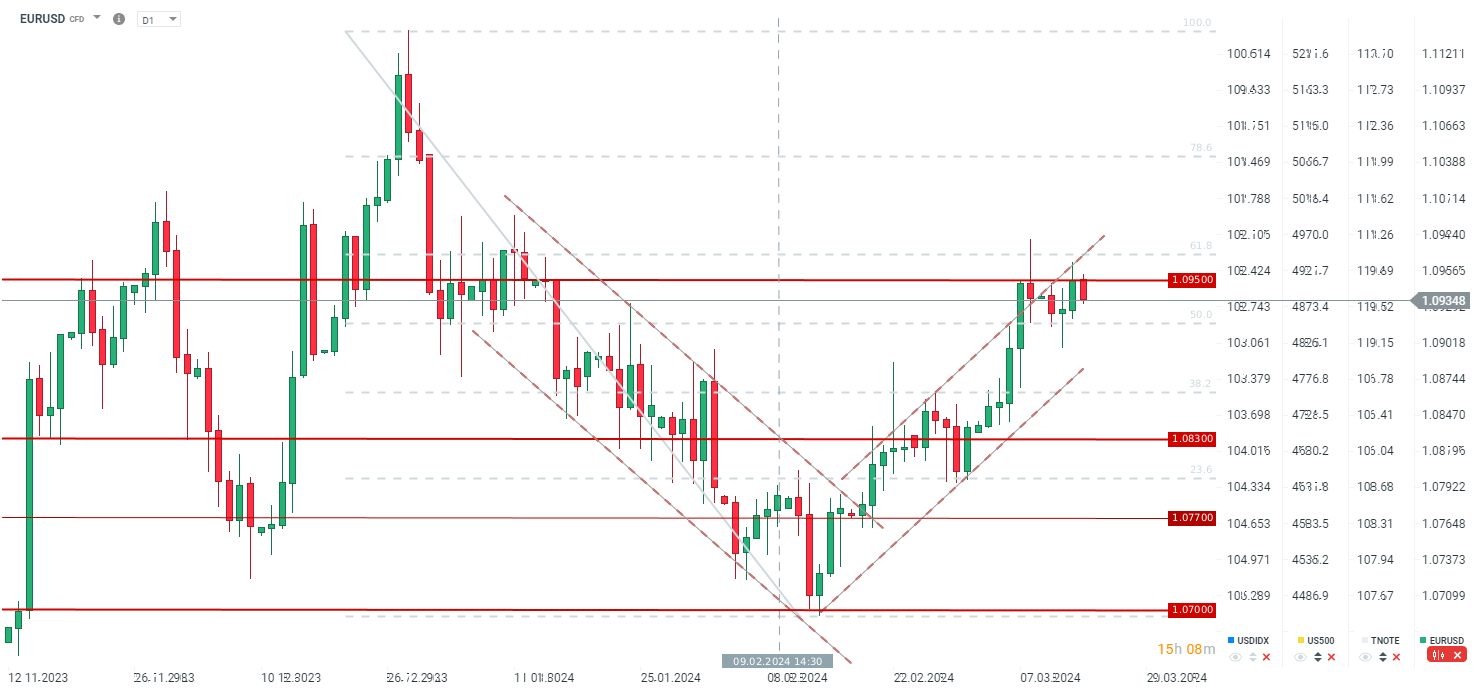 EURUSD cofa się. Kluczowe wsparcie przy zniesieniu 50.0. Patrząc na ostatni mocny wzrost rentowności w USA, nie można wykluczyć kontynuacji spadku na parze. Dzisiaj o 13:30 PPI z USA. Źródło: xStation5