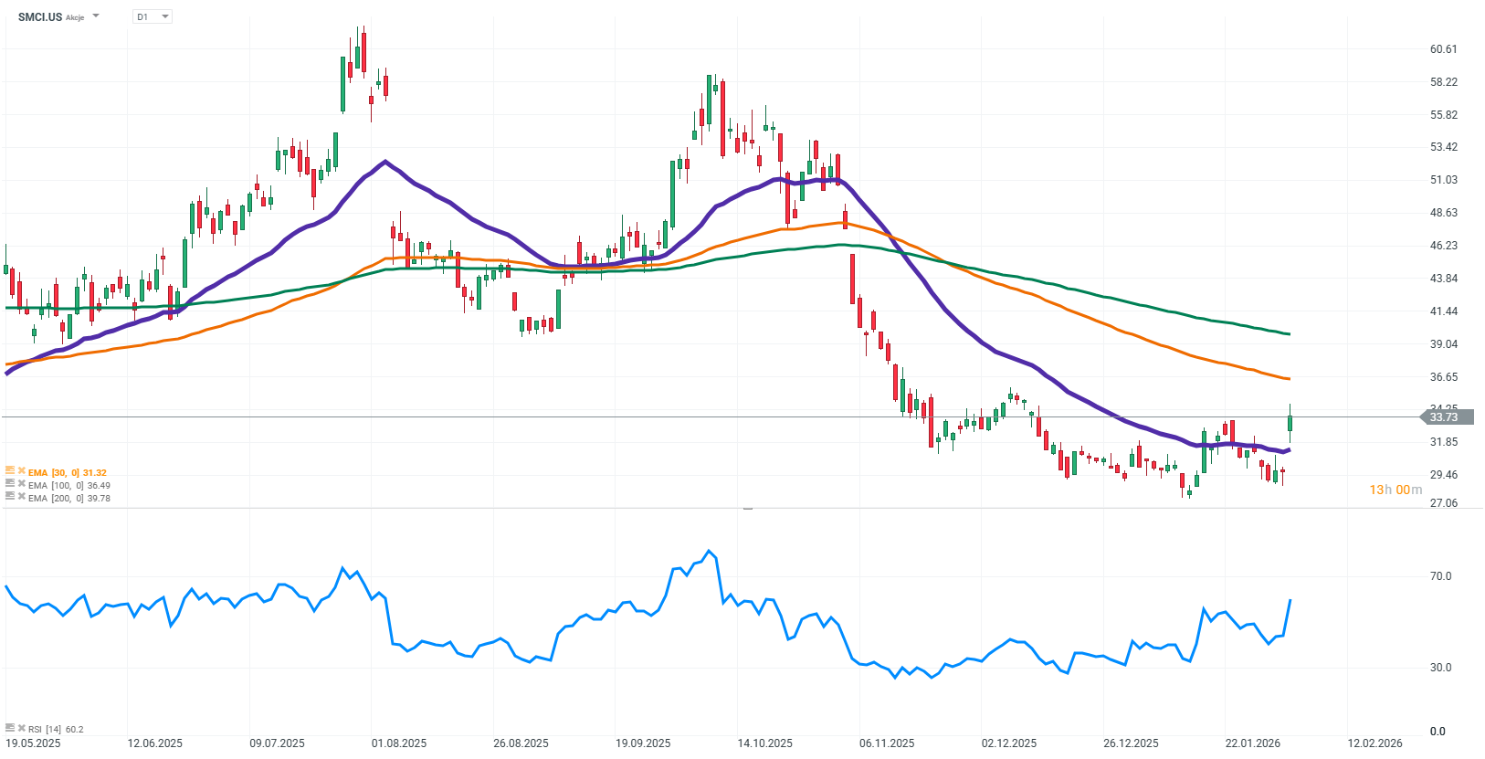 Publikacja wyników wywołała niemal natychmiastowy wzrost cen akcji, co w obecnym środowisku rynkowym jest wyjątkowo istotne. Obecnie panuje duża ostrożność, a nawet dobre wyniki często są korygowane, jeśli nie są wybitne. Inwestorzy są dodatkowo wyczuleni na ryzyko przewartościowania spółek technologicznych oraz rosnącą presję na nakłady inwestycyjne w sektorze Big Tech. W tym kontekście SMCI wyróżnia się jako „wzorowy uczeń”, dostarczając wyniki i prognozy entuzjastycznie przyjęte przez rynek.