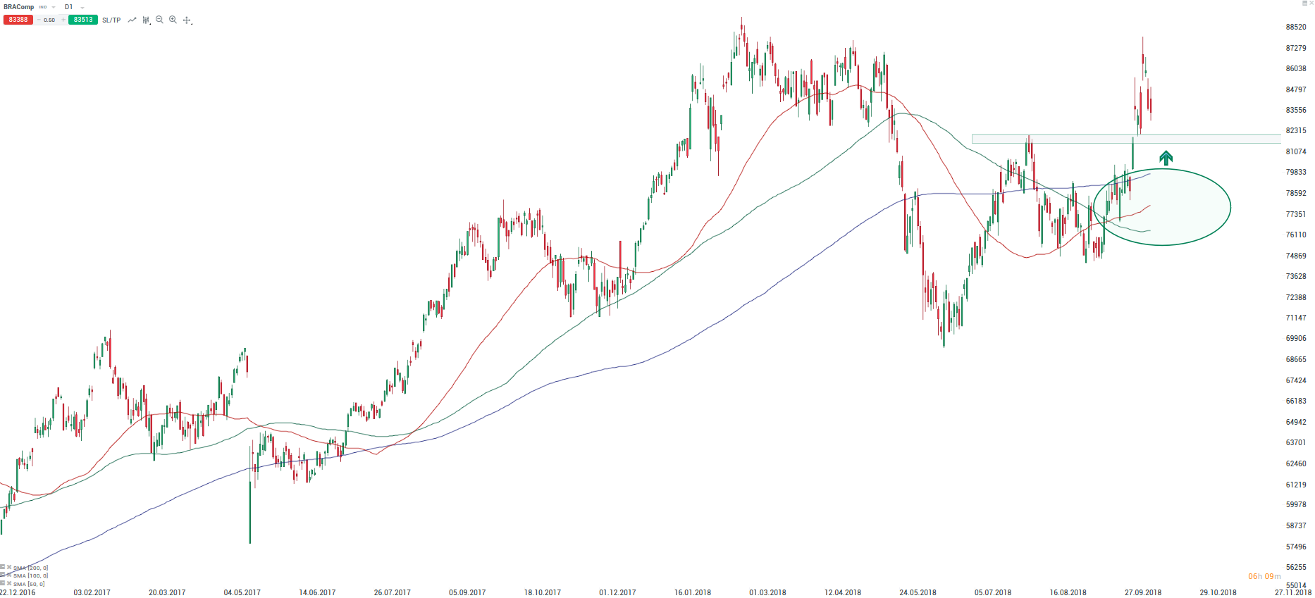 Ostatnim indeksem jest brazylijska Bovespa (BRAComp). Jest to jedyny indeks, na którym widać powiew optymizmu. Wszystko za sprawą ostatnich wydarzeń na arenie politycznej i wygranej w pierwszej turze wyborów prezydenckich pro-rynkowego Bolsonaro. Dodatkowo według najnowszych sondaży w drugiej turze ma on uzyskać około 58%, a jego kontrkandydat - Fernando Haddad 42%. Taki rozwój wydarzeń to z pewnością dobra informacja dla rynków, co mogłoby wspomóc brazylijską giełdę. Kluczowa jest jednak poprawa sytuacji na światowych rynkach.