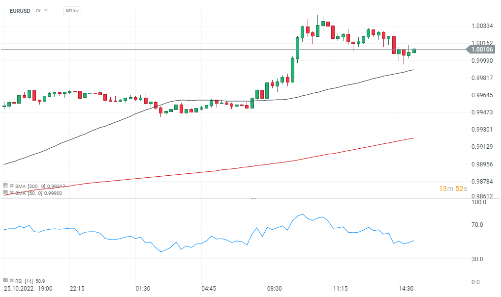EURUSD utrzymuje się powyżej parytetu. Wskaźnik siły względnej RSI znajduje się na neutralnym poziomie, co daje pole do ew. dalszego osłabienia amerykańskiej waluty. Źródło: xStation5