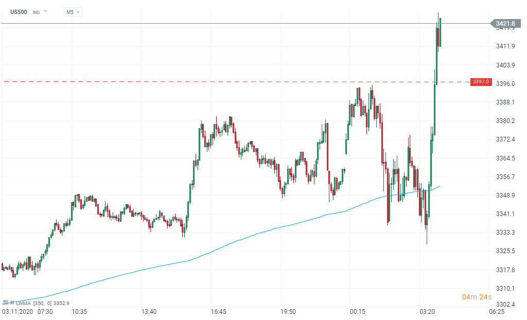 Na indeksach mamy ogromne wzrosty – US500 rośnie blisko 100 pkt. od niedawnych minimów i przekracza poziom 3400 punktów!
