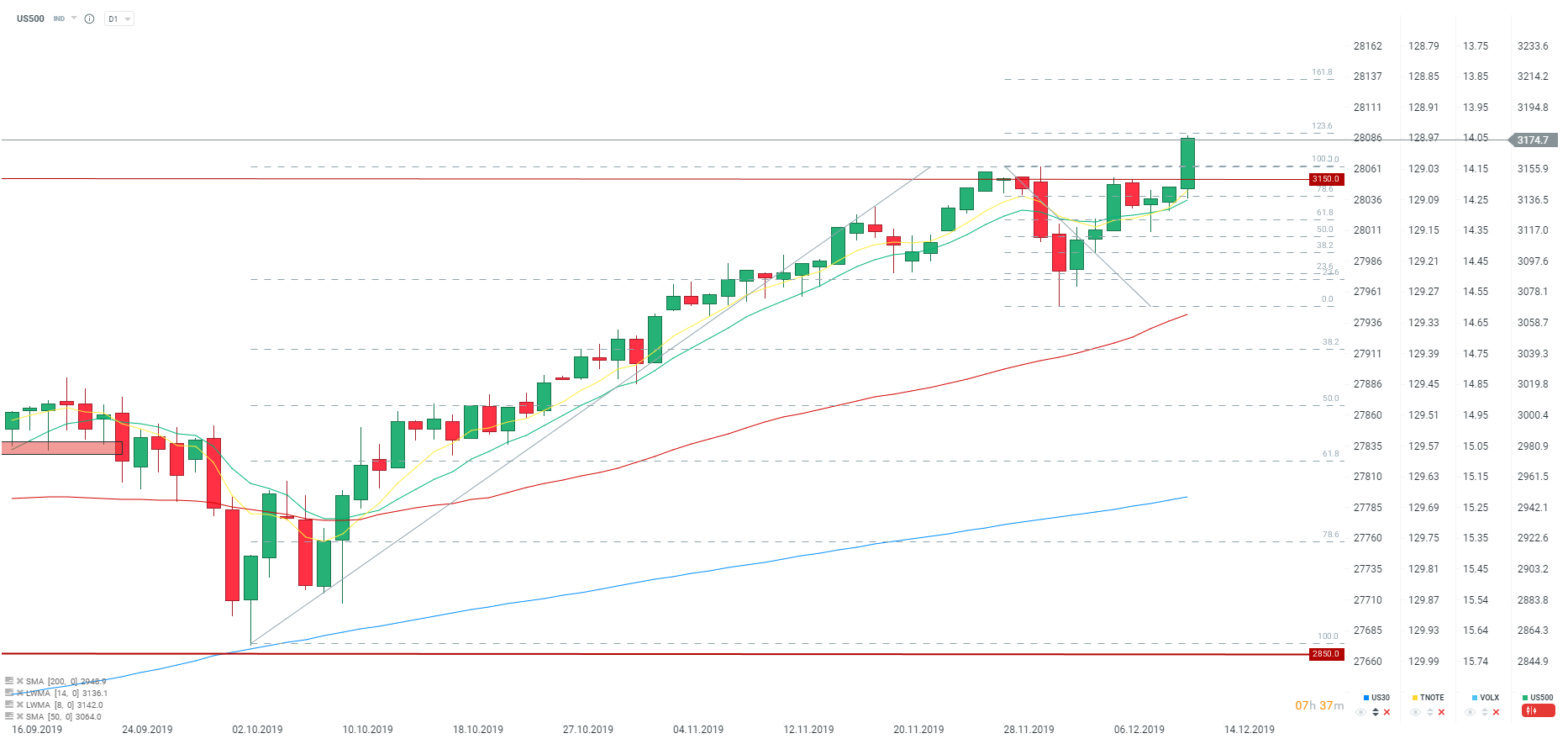 S&P 500 reaguje bardzo mocno i testuje okolice 3175 punktów. Nieco wyżej znajduje się potencjalny opór w postaci zniesienia 123.6 ostatniej dużej fali spadkowej na S&P 500.
