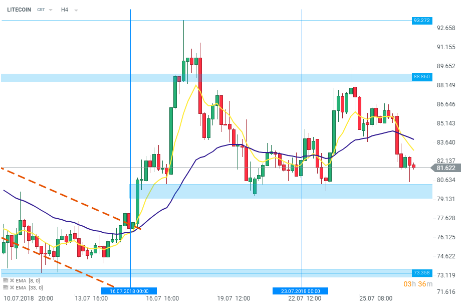 LITECOIN znajduje się nieco powyżej wcześniejszego poziomu wahań w okolicach 80 dolarów. Waluta cyfrowa niedawno przełamała swoją 33-okresową średnią kroczącą na wykresie H4 (fioletowa linia). Presja spadkowa może sprawić, że kryptowaluta zacznie testować krótkoterminową strefę wsparcia ($79,40-$80,60) w niedalekiej przyszłości. Źródło: xStation5
