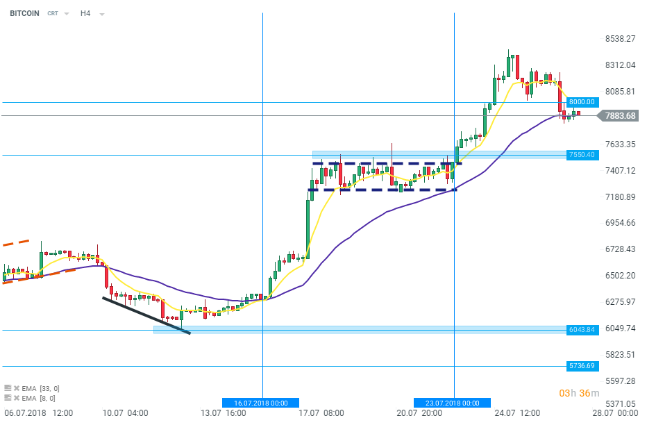 Ostatnia szarża bitcoinowych byków prawdopodobnie się skończyła. Kryptowaluta spadła z poziomu 8400 dolarów do poziomu blisko 7800 dolarów w dwa dni! Obecnie BITCOIN znajduje się w okolicach poziomu 7900 dolarów, testując tym samym swoją 33-okresową średnią ruchomą na wykresie H4 (fioletowa linia). Wyraźne przełamanie wspomnianej średniej może poskutkować dłuższym ruchem spadkowym. Źródło: xStation5