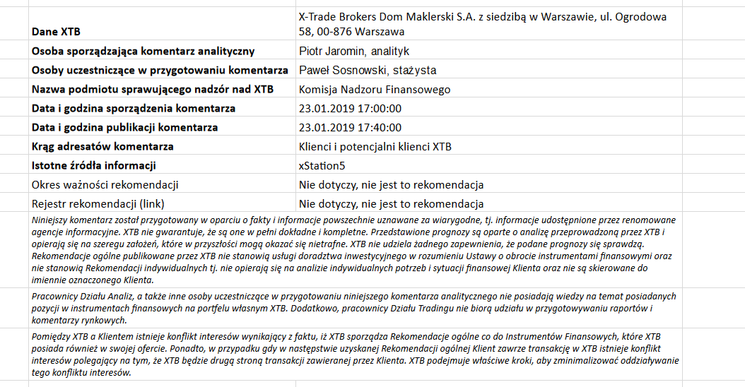 Ta publikacja handlowa jest informacyjna i edukacyjna. Nie jest rekomendacją inwestycyjną ani informacją rekomendującą lub sugerującą strategię inwestycyjną. W materiale nie sugerujemy żadnej strategii inwestycyjnej ani nie świadczymy usługi doradztwa inwestycyjnego. Materiał nie uwzględnia indywidualnej sytuacji finansowej, potrzeb i celów inwestycyjnych klienta. Nie jest też ofertą sprzedaży ani subskrypcji. Nie jest zaproszeniem do nabycia, reklamą ani promocją jakichkolwiek instrumentów finansowych. Publikację handlową przygotowaliśmy starannie i obiektywnie. Przedstawiamy stan faktyczny znany autorom w chwili tworzenia dokumentu. Nie umieszczamy w nim żadnych elementów oceniających. Informacje i badania oparte na historycznych danych lub wynikach oraz prognozy nie stanowią pewnego wskaźnika na przyszłość. Nie odpowiadamy za Twoje działania lub zaniechania, zwłaszcza za to, że zdecydujesz się nabyć lub zbyć instrumenty finansowe na podstawie informacji z tej publikacji handlowej. Nie odpowiadamy też za szkody, które mogą wynikać z bezpośredniego czy też pośredniego wykorzystania tych informacji. Inwestowanie jest ryzykowne. Inwestuj odpowiedzialnie.