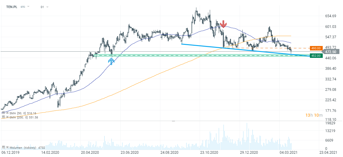Notowania Ten Square Games (TEN.PL) znajdują się dziś pod presją sprzedających, a cena akcji spada do najniższych poziomów od czerwca 2020. Producent gier przedstawił raport roczny po zakończeniu wczorajszej sesji. W 4Q 2020 spółka miała 31,9 mln PLN zysku netto (spadek o 8,4% r/r). Konsensus PAP zakładał 65,4 mln PLN, jednak już po jego publikacji spółka gamingowa poinformowała o dokonaniu korekty, która obniżyła zysk operacyjny o 30,2 mln PLN. W całym 2020 roku spółka miała 151,6 mln PLN zysku netto (+98% wobec 2019).