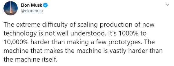 Musk napisał, na swoim koncie na Twitterze, że mało kto rozumie ekstremalną trudność wprowadzenia nowej technologii do produkcji.