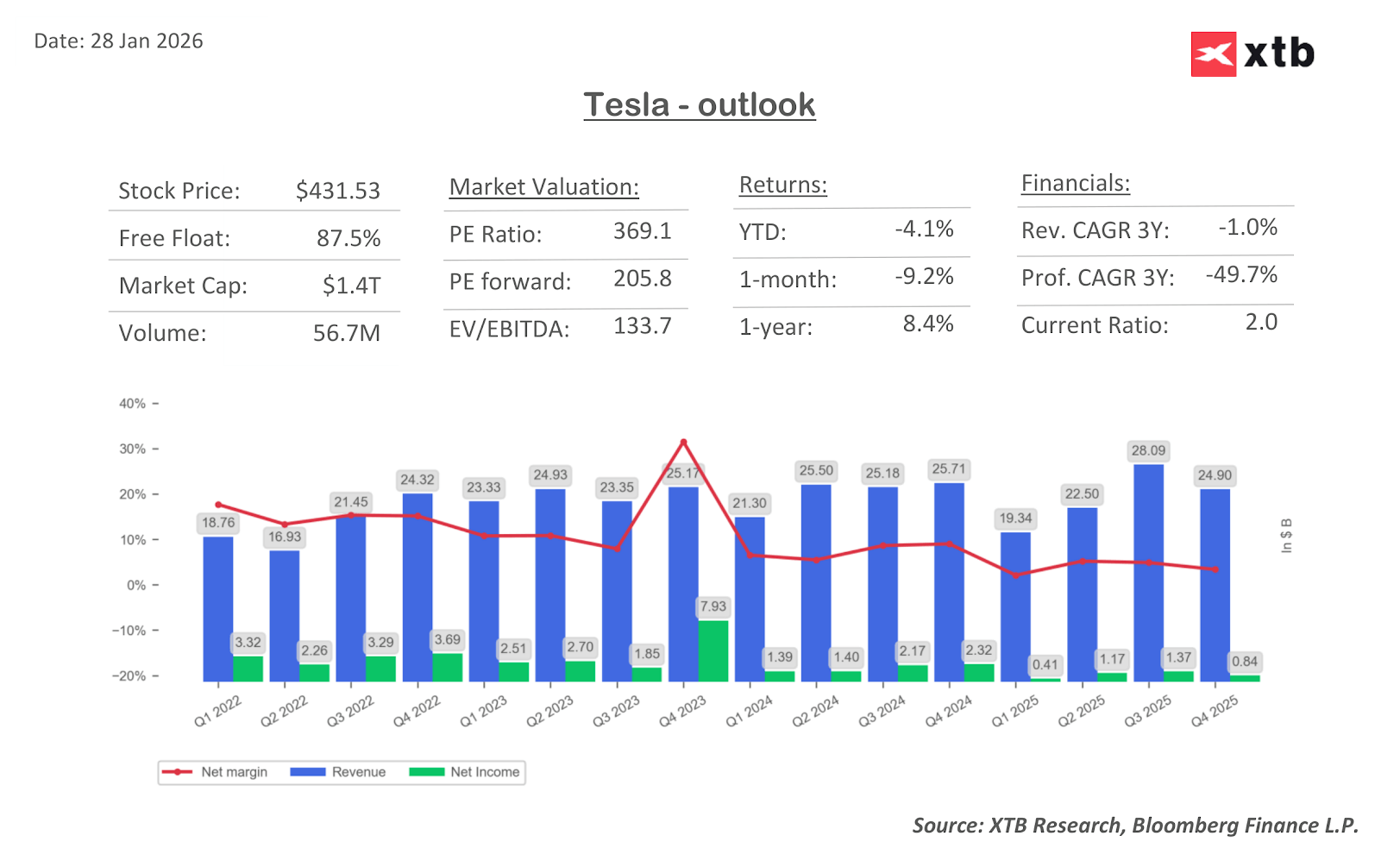 - Robotaksówki (Cybercab): Choć Musk od lat obiecuje autonomiczną rewolucję, a rynek wierzy, że kwiecień 2026 r. będzie przełomem. Nawet ograniczona usługa w Austin i San Francisco jest postrzegana jako "dowód zysków przyszłości" (Proof of Concept), który dzięki skali fabryk Tesli może zmiażdżyć konkurencję.