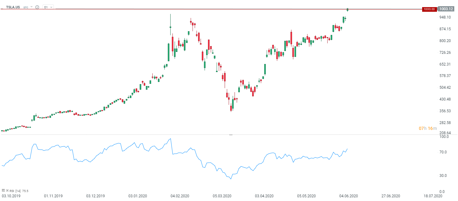 Akcje spółki motoryzacyjnej Tesla (TSLA.US) zajmującej się produkcją samochodów elektrycznych rośnie do poziomu powyżej 1000 USD, pierwszy raz w historii. Dzisiejsze otwarcie prowadzi do pokonania wcześniejszych rekordowych poziomów z lutego. Warto zauwazyć, że inwestorzy w szczególności zainteresowani spółkami technologicznymi mają nadzieje na kolejne działania ze strony Fed. Nasdaq przekracza poziom 10000 punktów i osiąga kolejne rekordy. Przypomnijmy, Fed opublikuje swoją decyzję na temat narzędzi polityki monetarnej oraz prognozy makroekonomiczne o godzinie 20:00.