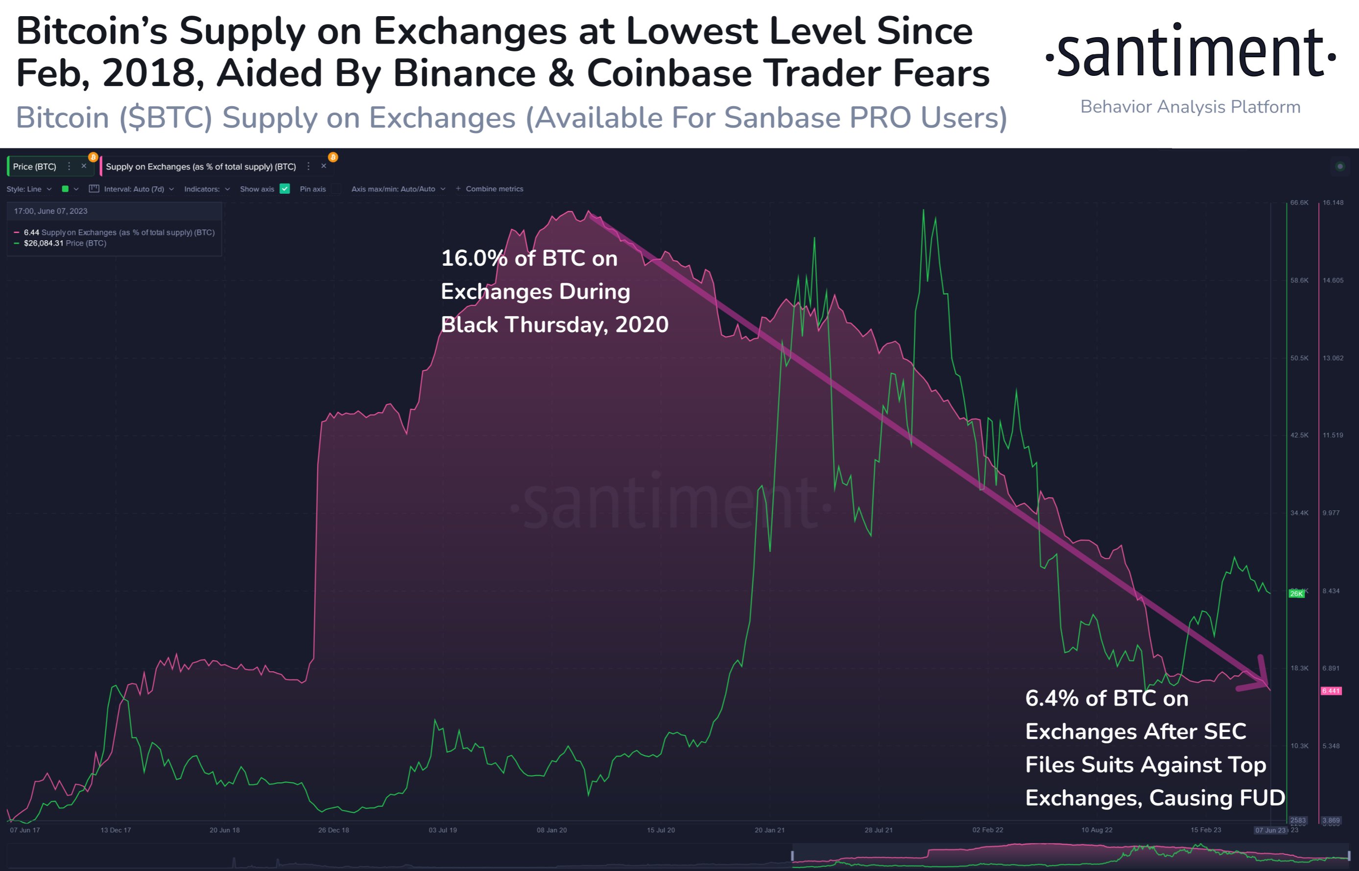 Ilość BTC na scentralizowanych giełdach kryptowalutowych (CEX) jest obecnie najniższa od 2018 roku ponieważ rynek obawia się ew. kryzysu systemowego. Wobec procesu wymierzonego w Binance, inwestorzy znów poczuli sie niepewnie i masowo wycofują swoje kryptowaluty na tzw. 'zimne portfele'. Marazm na rynku potencjalnie może ujawnić kolejne 'pęknięcia' i w skrajnym przypadku bankructwa podmiotów z branży crypto. Źródło: Santiment