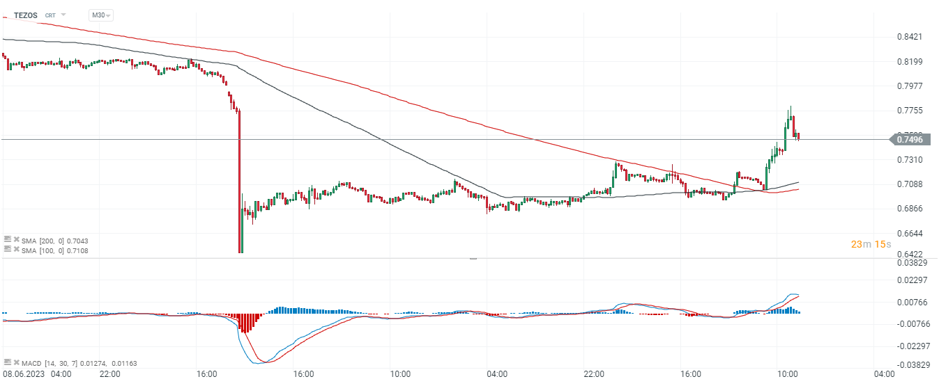 TEZOS, interwał M30. Kryptowaluta próbuje ograniczyć ostatnie dynamiczne wyprzedaże. Średnie SMA200 i SMA100 na niskim interwale uformowały 'złoty krzyż' wskazujacy na możliwie większą ilość paliwa do wzrostów. Warto jednak podkreślić, że Tezos może być ekstremalnie wrażliwy na sentyment głównej kryptowaluty Bitcoin. Źródło: xStation5