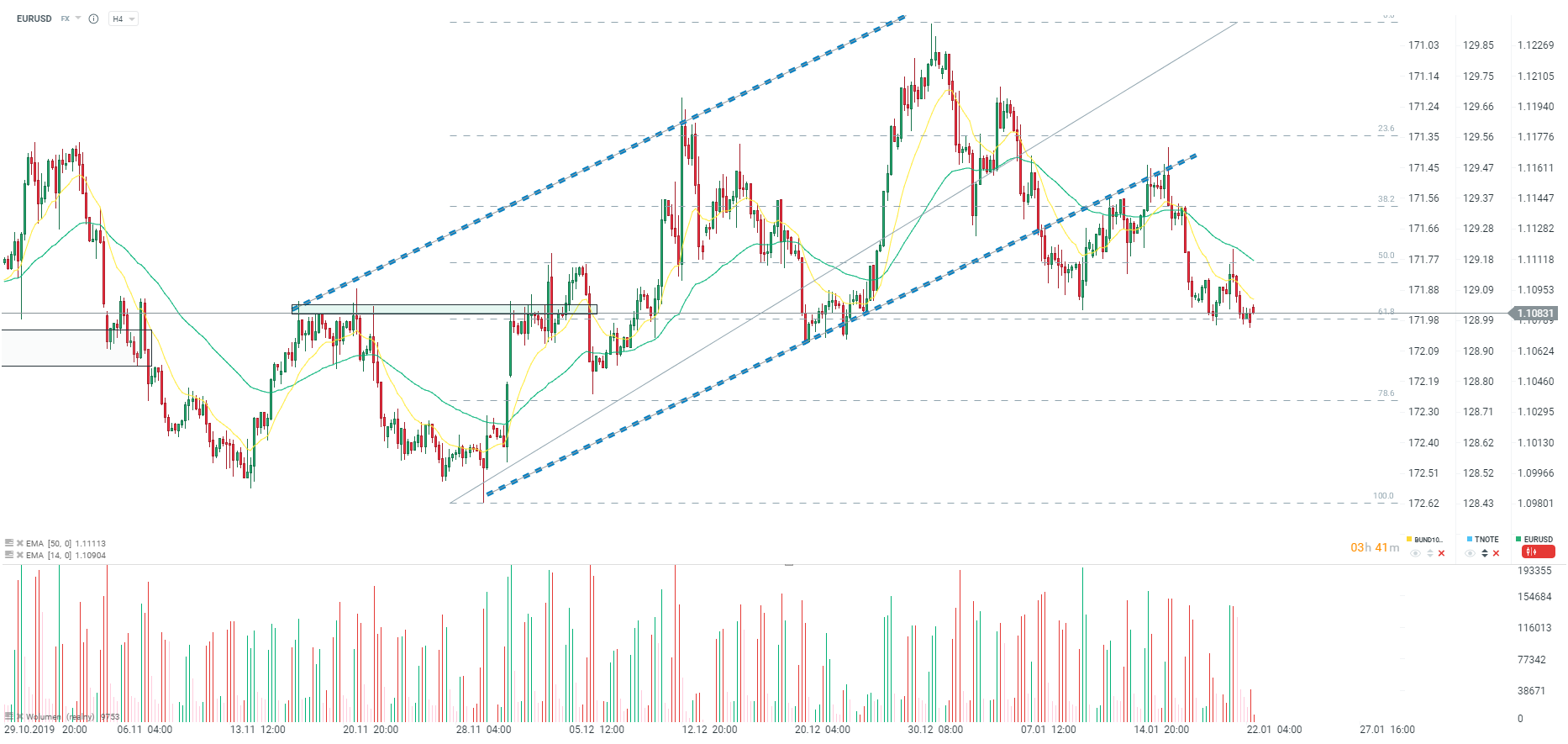 EURUSD powraca powyżej zniesienia 61.8. Z drugeij strony widać spory opór w postaci strefy podażowej związanej ze średnimi ruchomymi. Źródło: xStation5