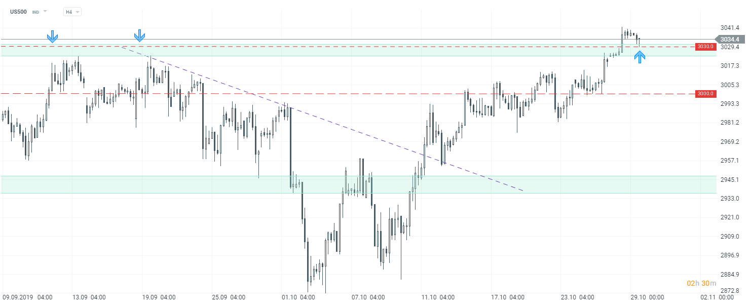 Z ostatnich doniesień rynkowych wynika, że na najbliższym spotkaniu prezydentów USA i Chin ma dojśc do podpsiania wstępnego porozumienia handlowego. Po opublikowanym przez South China Morning Post artykule, widać nieznaczne odbicie na rynku akcji, który korygował wczorajszy ruch w górę. Jest to dobry prognostyk przed zbliżającym się początkiem sesji w USA. Patrząc technicznie na indeks S&P 500 (US 500), cena reaguje na wysokości pokonanej wczoraj strefy oporowej. Aktualnie zgodnie z zasadą biegunowości obszar przy poziomie 3030 pkt powinien stanowić kluczowe wsparcie. Tak długo jak kurs znajduje się powyżej, istnieje szansa na kontynuację trendu wzrostowego. Jeżeli jednak doszłoby do powrotu poniżej, może rozpocząć się korekta spadkowa.