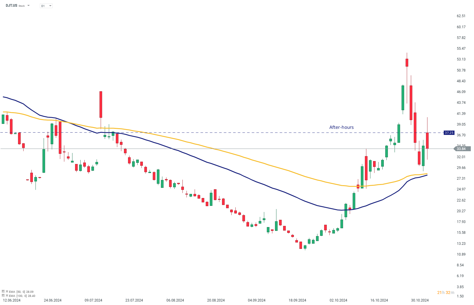 Trump Media & Technology (DJT.US) zanotowały dynamiczne odbicie w notowaniach po zamknięciu. Wraz z napływającymi informacjami odnośnie wyników ze stanów, inwestorzy coraz mocniej wydają się przesuwać w stronę szansy na zwycięstwo kandydata Republikanów. Jednak wraz ze zbliżeniem się do końca notowań po zamknięciu, wahania ceny spółki Trump Media & Technology Group powróciły ze szczytowego poziomu w okolicach 49,78 $ do 37,48 $, co dalej oznacza poziom wyższy o ponad 9% w porównaniu do ceny zamknięcia sprzed nocy wyborczej.