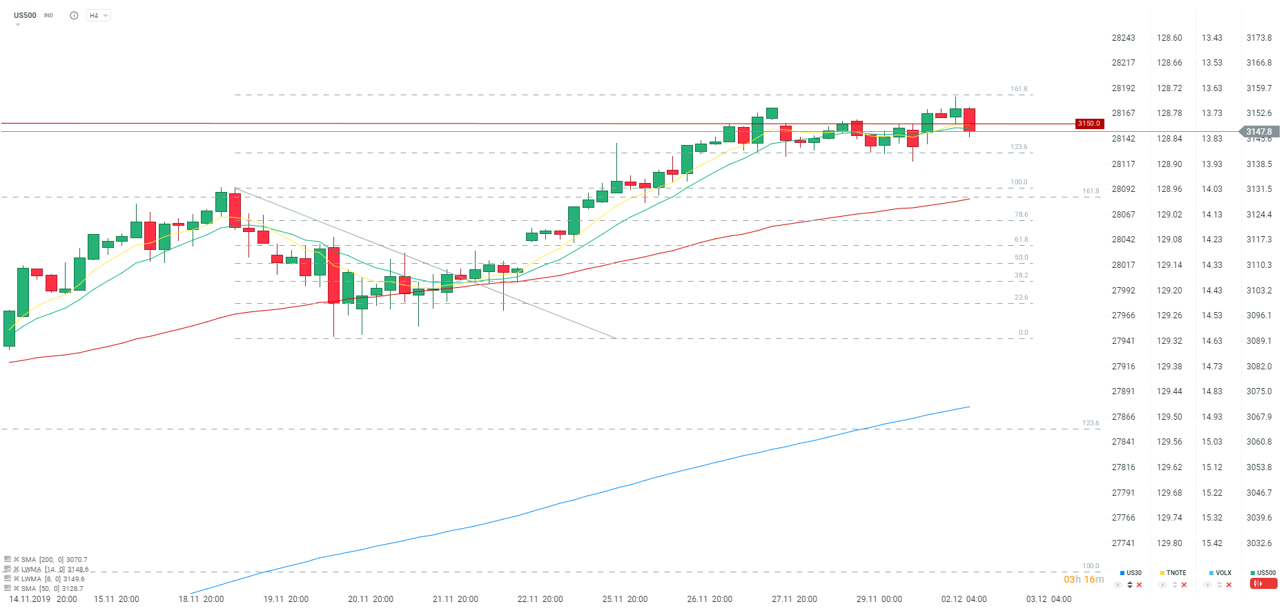 S&P 500 cofa się wyraźnie po publikacji słów ze strony Donald Trumpa. Wcześniej doszło do przetestowania okolic zniesieni 161.8 poprzedniego cofnięcia. Ważne wsparcie to okolice zniesienia 123.6, a następnie przy średniej 50 okresowej przy poziomie 3130 puntków. Źródło: xStation5