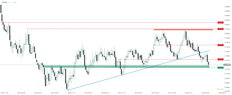 Dolar australijski traci o poranku, ale spadek jest bardziej spowodowany nastawieniem “risk-off” na rynku niż “minutkami” RBA. Cena zbliża się do ważnej strefy popytowej, w której może nastąpić odbicie. Źródło: xStation5