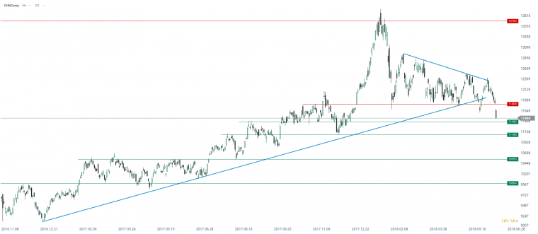 Wraz ze wzrostem napięcia między USA, a Chinami CHNComp zanurkował. Najbliższym poziomem wsparcia może być 11400 pkt. Następny w kolejce jest psychologiczny poziom 11000 pkt. Źródło: xStation5