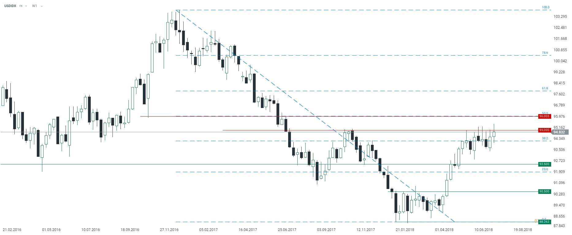 Amerykański dolar ponownie cofa się poniżej ważnego oporu, co prowadzi do względnego utrzymania konsolidacji. Widać jednak, że istnieje presja na wybicie się z tej konsolidacji. Powrót w okolice 94,30 byłby jednak sygnałem silnie podażowym. Źródło: xStation5