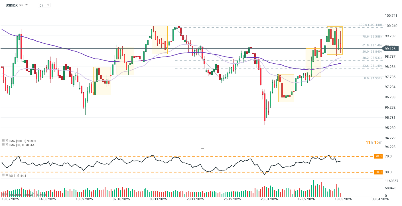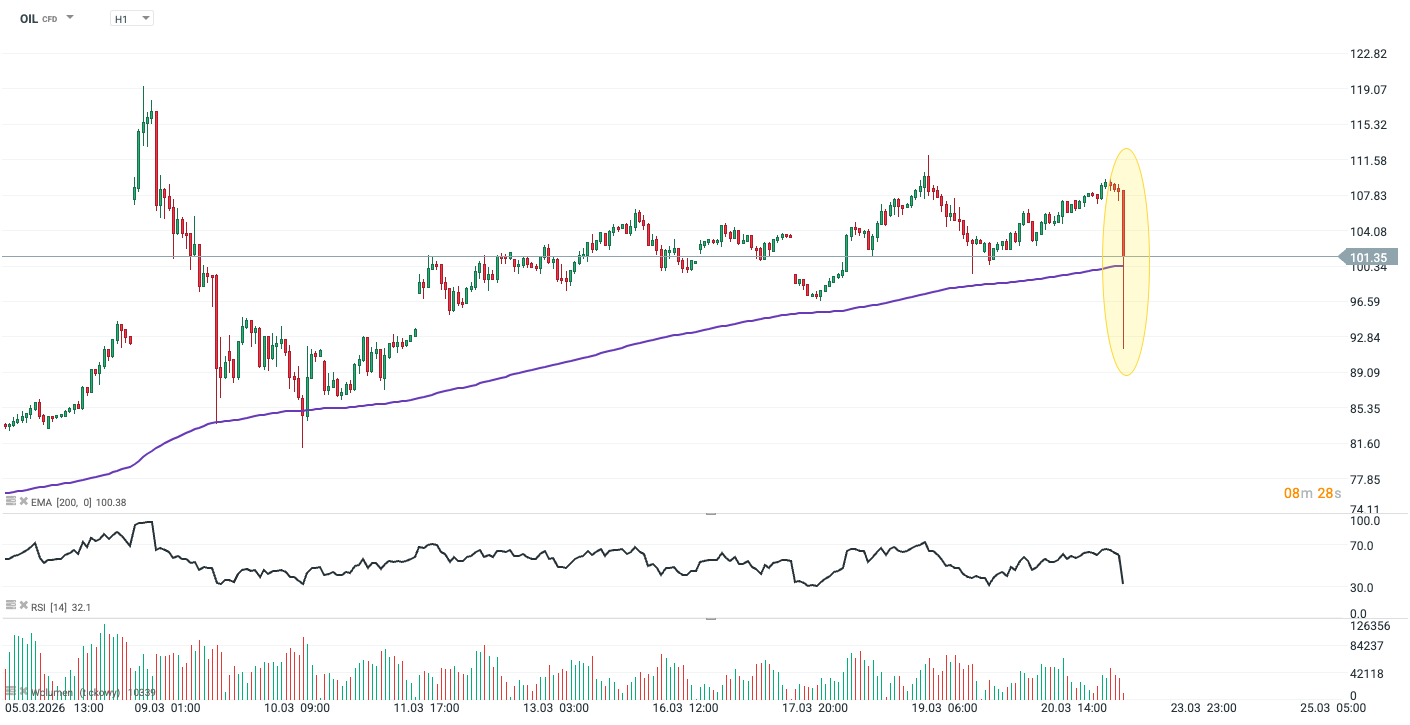 Indeks dolara drastycznie zawraca (USDIDX: -0,6%) w reakcji na deklarację Donalda Trumpa, iż zarządził on odwleczenie wszelkich ataków na irańską infrastrukturę energetyczną na najbliższe pięć dni. W komunikacie prezydent USA dodał, że w ciągu ostatnich dwóch dni obie strony konfliktu przeprowadziły produktywną dyskusję na temat potencjalnego zatrzymania działań.