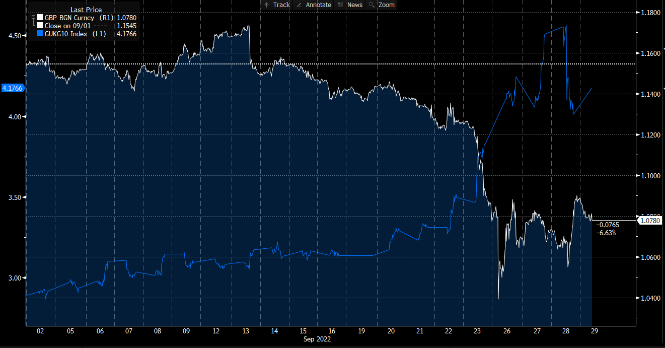Rentowności ponownie odbijają z okolic 4%, a funt powraca do spadków względem dolara. Źródło: Bloomberg