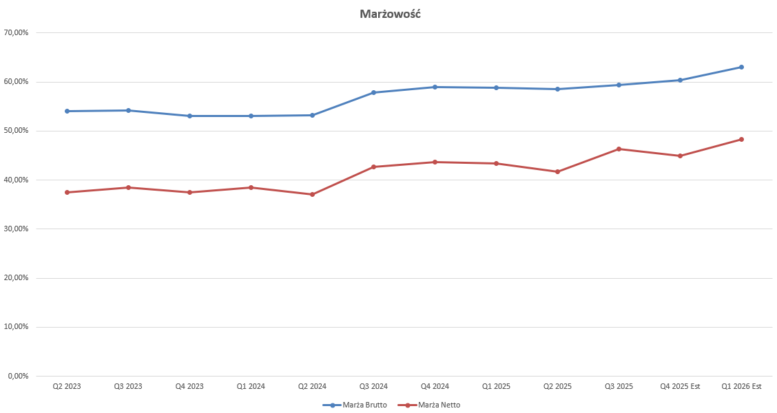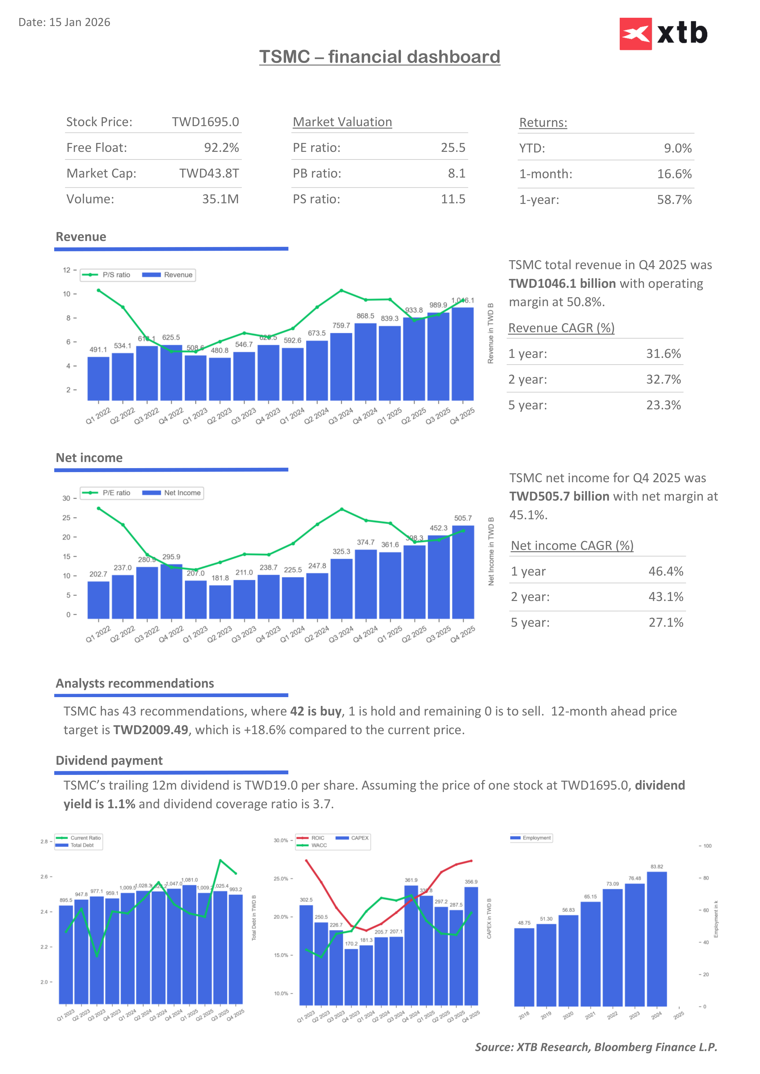 TSMC rozpoczyna 2026 rok z mocnym momentum i bardzo optymistycznymi prognozami. Zarząd prognozuje przychody na pierwszy kwartał w przedziale 34,6–35,8 miliarda USD, co oznacza dalszy, dwucyfrowy wzrost w porównaniu z tym samym okresem roku poprzedniego. Marża brutto przewidywana jest na 63–65%, a marża operacyjna na 54–56%, co pokazuje, że spółka utrzymuje zdolność do generowania wysokiej rentowności nawet przy rosnących nakładach inwestycyjnych i dynamicznym popycie na chipy AI.