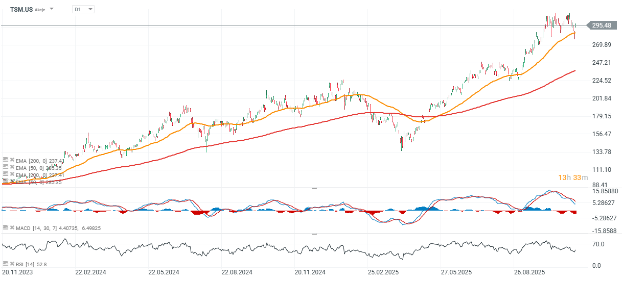 Akcje spółki ostatnio spadły poniżej EMA50, ale szybko odrobiły straty. Dla byków kluczowe będzie odzyskanie poziomu 300 USD za walor, które uprawdopodobniłoby wzrost na historyczne szczyty. Choć przychody w październiku okazały się nieco rozczarowujące, biorąc pod uwagę dotychczasową dynamikę TSMC, niemal na pewno podyktowane są czynnikami sezonowymi i jednorazowymi, niezwiązanymi z działalnością operacyjną. Zakłady spółki działają na pełnych obrotach, a wysokomarżowe półprzewodniki odpowiadają za coraz większą część całkowitej sprzedaży.