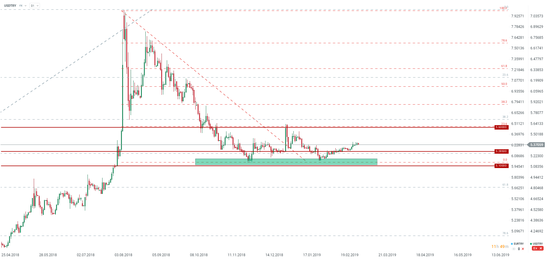 Lira umacnia się w stosunku do amerykańskiego dolara. Nie jest to jednak dynamiczny ruch, który zagraża krótkoterminowemu trendowi wzrostowemu. Warto zauważyć, że lira reaguje gwałtownie na pojawianie się negatywnych informacji. W ostatnim czasie ponownie zaczyna być nieco głośniej na temat napięć pomiędzy USA oraz Turcją, w związku z Syrią oraz umową na system rakietowy. Źródło: xStation5