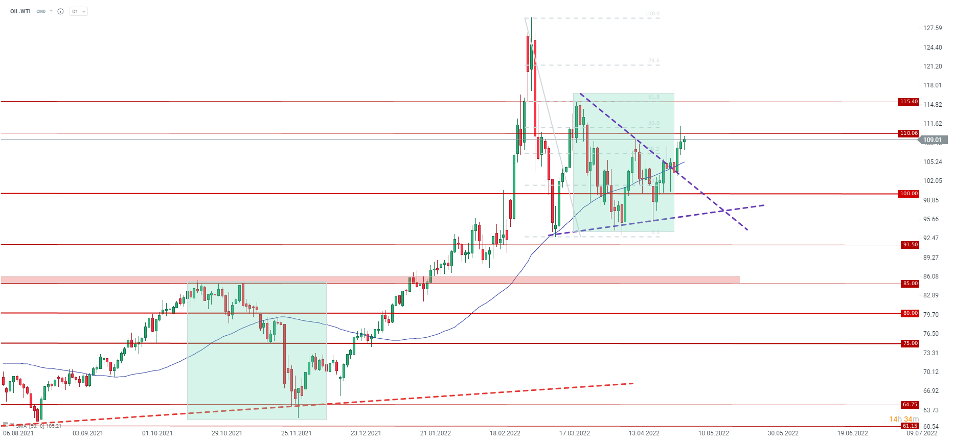 Ropa WTI ponownie zmierza do przetestowania poziomu 110 USD. Stabilizacja pwoyżej tego poziomu może pozwolić na kolejne przetestowanie poziomu 115 USD. Niemniej nie powinniśmy oczekiwać większej zmienności. W przypadku realizacji scenariusza prezentowanego przez Europę oraz kontynuacji importu rosyjskiej ropy przez Chiny czy Indie, rynek ropy nie powininen przekroczyć poziomó 120 USD i ustabilizowac się w zakresie 95-115 USD za baryłkę.