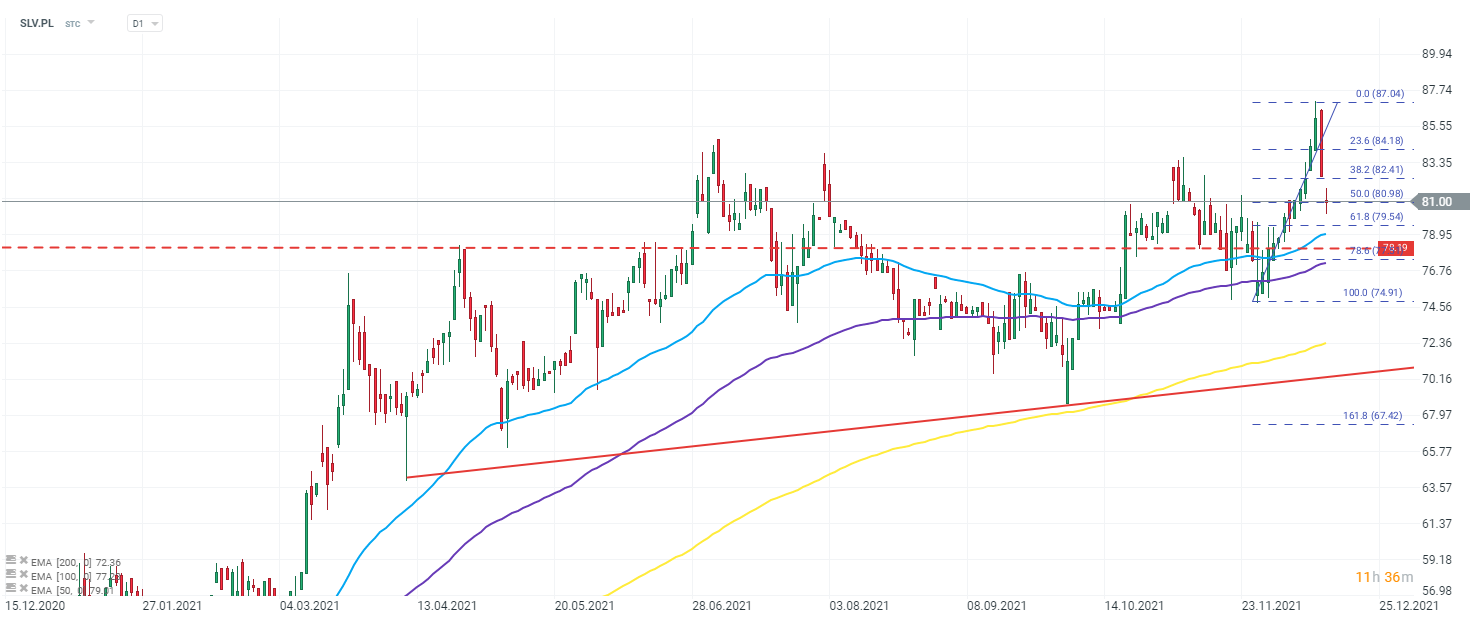 Wykres spółki Selvitas (SLV.PL), interwał D1. Ceny akcji obecnie testują zniesienie 50%, ostatnigo implulsu wzrostowego, gdzie spółka wybiła swoje nowe ATH. Spółka w ujęciu średnio- i długo- terminowym porusza się w trendzie wzrostowym. Najbliższym wsparciem pozostaje zniesienie 61.8%, które dodatkowo jest wzmocnione przez EMA 50 (niebieska linia). Źródło: xStation 5